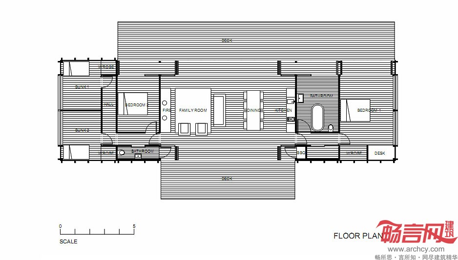 房子的起居室面向大海,是一个开放的空间,给人一种野营的感觉;而卧室则是相对封闭的,而且室内也很凉爽。房子里还有一个大壁炉,因此冬天居住也是不成问题的。