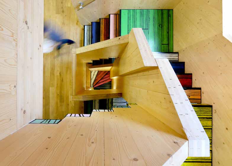 DRMM工作室为艺术家Richard Woods设计了位于伦敦Hackney区的工作室兼住所项目。艺术家业主标志性的卡通风格为建筑立面和楼梯增添了色彩。Richard Woods最为人所知的是以彩色木纹图案装饰家具和织物。项目名为“WoodBlock住宅”,将木纹装饰图案融入建筑设计中。白色、黄色、绿色的木板沿建筑前后立面水平排列。同时,这些彩色木板出现在楼梯踏步上,形成粉白、艳红、宝蓝、果绿等彩虹般的色列。设计师认为住宅设计是一次实验性项目,在成品的各个方面展现出家居装饰质朴、精炼的愉悦感。
