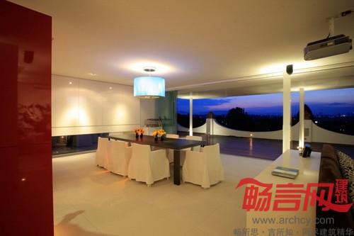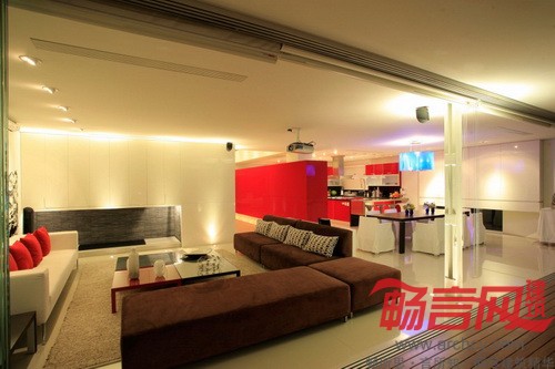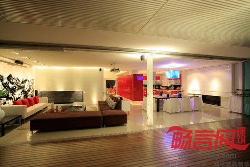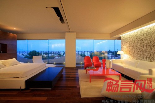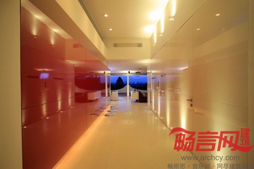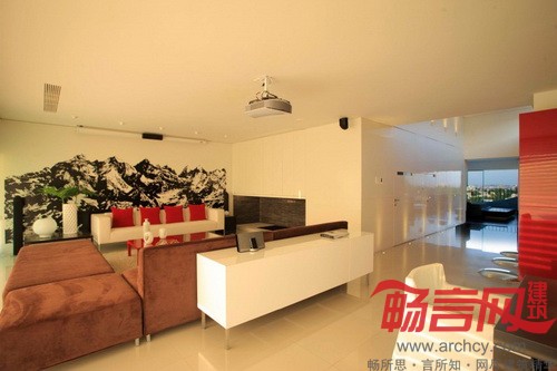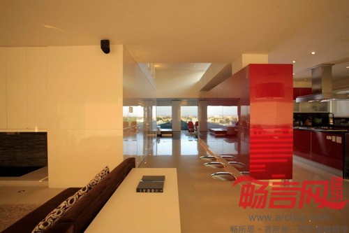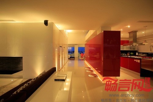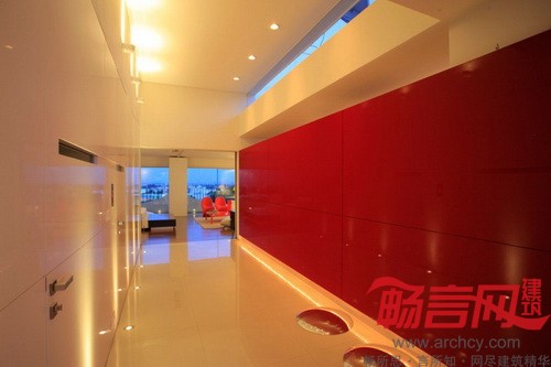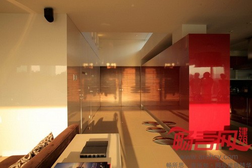 “其他室内空间由两道墙隔开,一道红墙将厨房和服务区隔开,另一道白墙将楼梯和电梯隔开。由于房子是朝西的,为了增强室内反光效果,我们采用了色泽光亮的地板。”设计师说。