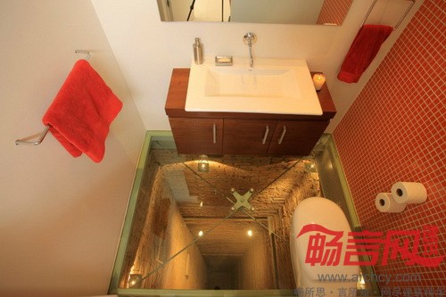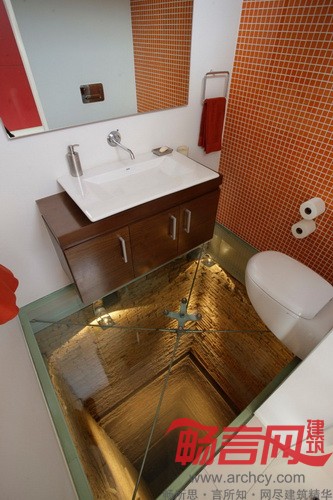 “有一点值得一提,这也是本次改装项目的一个特点:房子里有一个空置的电梯井,这里原本是要为大楼安装第二套电梯的,但是一直没有安装成,就留下了一个深洞。我们用玻璃把这个电梯井盖起来,把这里改造成了一间盥洗室。透过玻璃,可以一直看到15楼底。”设计师说。
