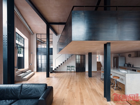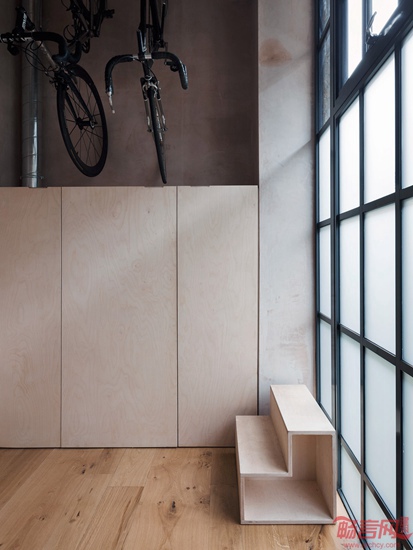 Sadie Snelson建筑事务所将伦敦东部一个库房改造成摄影师的生活工作空间。项目设有折叠铁楼梯,夹层和存放自行车的墙面空间。改造之前的Clapton仓库被分隔成若干小房间,自然光线不足。设计师认为,原先的空间使用功能不佳,朝内的房间过于阴暗,潮湿问题严重,窗户甚至结露。项目团队去除了所有隔断,营造出开放式起居室,部分楼面被移除,创造了双倍层高区,使光线大为改善。