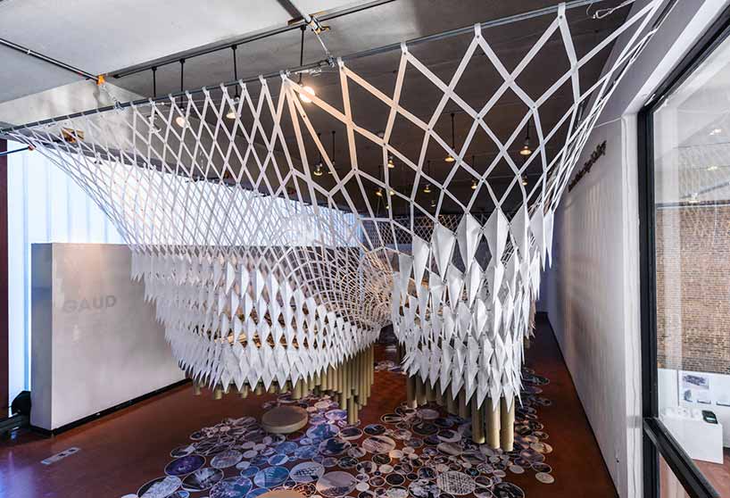 纽约普拉特艺术学院建筑城市设计研究生作品展在布鲁克林Robert Siegel艺术馆大规模展出。该展览每年都会制造一个雕塑结构,开拓数字化制造方法,展示已有技术作品。今年,在悬吊与工程平面上的漂浮平台上展示了若干建筑模型。每个基座起到建筑支撑和云状过滤结构作用,基座下方由硬纸筒制成,将游客引领到欣赏室内装饰的方位。进入观赏区域后,游客会发现模型全部处于街道平面上,近两年的学生设计作品图片位于下方,如同被纸筒投射出的图像。作品按类划分,展示学校文化是依照类型和有机属性催生这些作品的。