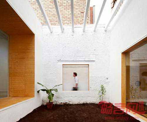 庭院被架在两个空间之间,大扇方窗让大量光线进入室内。三扇窗户添加了可以驻足的空间,使用者可以享受室外区域,而中间过渡区域也变得宜人舒适。