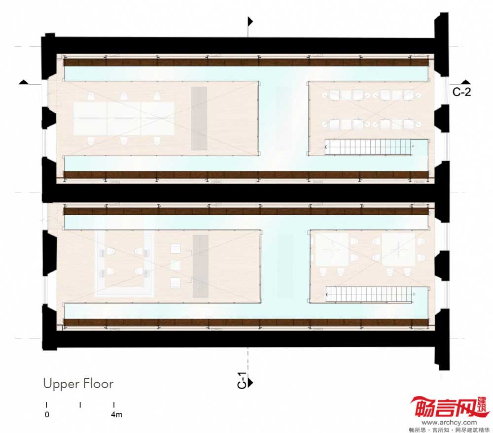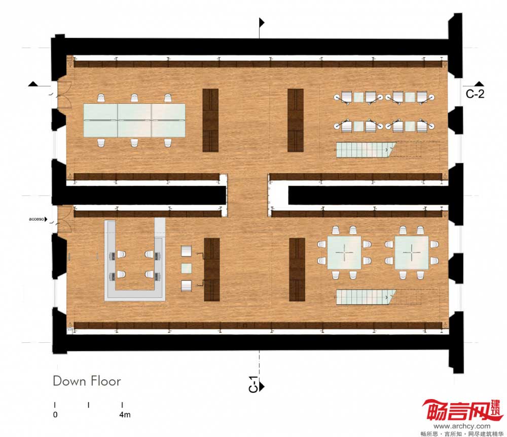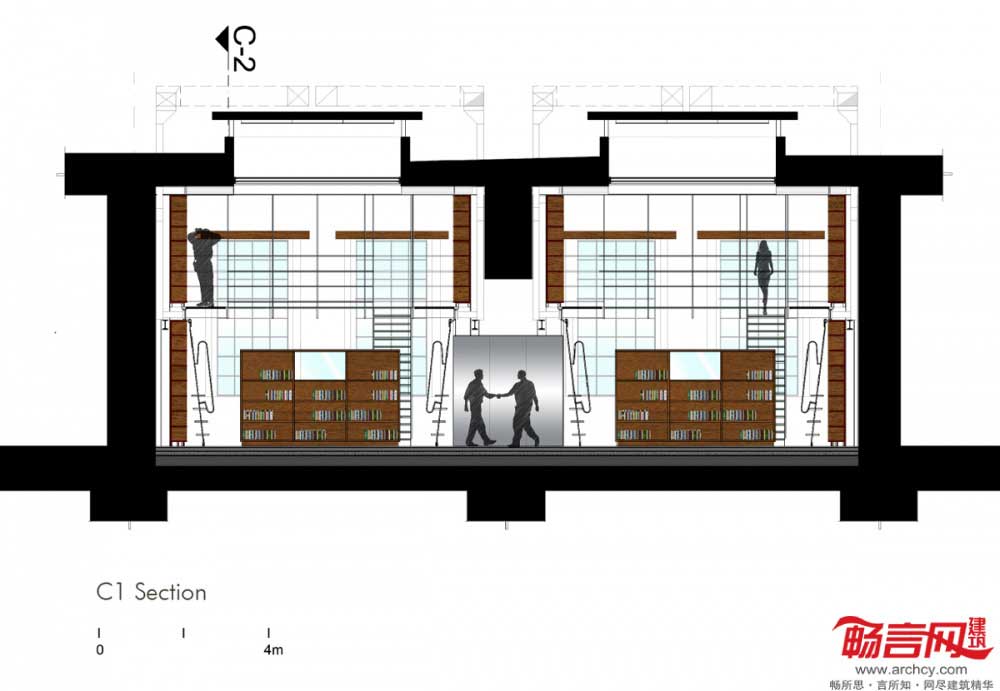 图书馆用于存放Antonio Castro Leal的私人藏书。固定的书架达到墙面的顶部,纵向的深色木板和水平方向的浅色木板以及半透明的玻璃形成了鲜明的对照。此外,白色桌椅也构成了视觉反差。除开放空间外,人们能够发现四个不同区域:接待处、协同工作区域、阅读区和研究区。