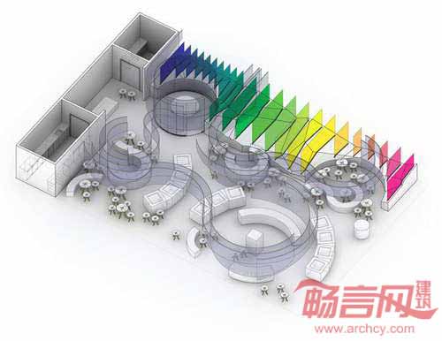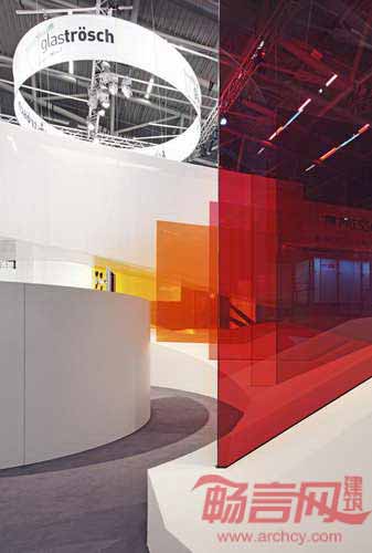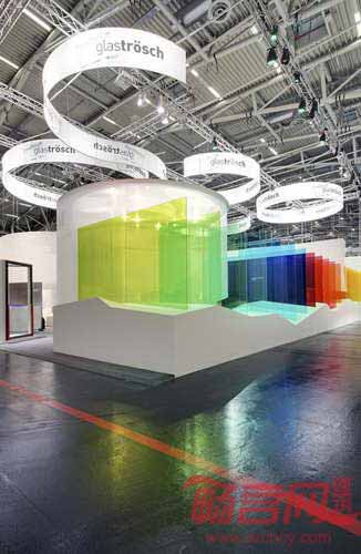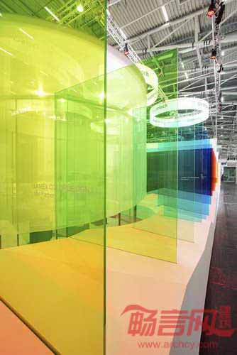 缤纷的玻璃板和玻璃帷幕一样,起到了视觉过滤的作用。随着参观者经过玻璃方阵,色彩发生了融合和改变,使展位给人日出般的神奇感受。