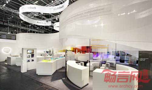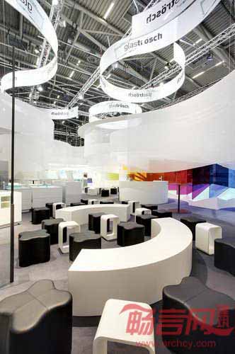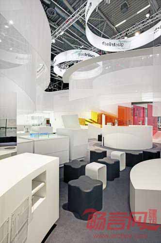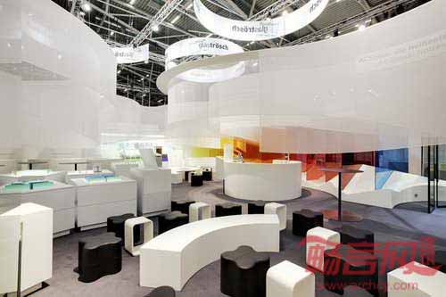 SOFTlab工作室Glastroesch公司设计了2013年德国慕尼黑国际建材展览会的展位。注意到常见展位都被局限在分配的一小块空间内,设计师决定不采用典型的方形展位,营造令人耳目一新的设计。设计师深入探索了对传统形式的突破,最终发现没有边缘的展位能够产生全方位的空间,这种空间不存在侧面、前部或后部。设计师试图模糊边缘或入口,使参观者容易在展位中“漫游”。
