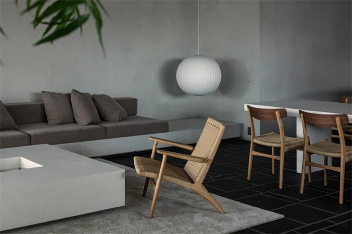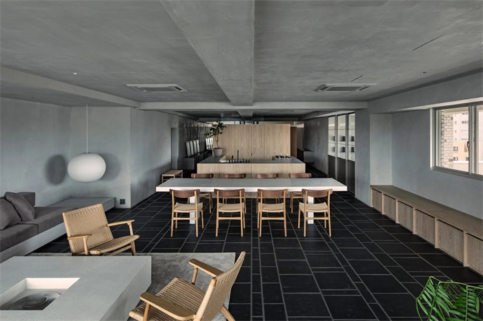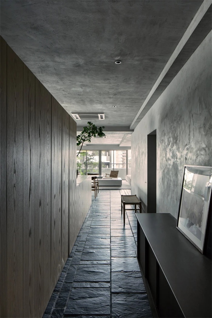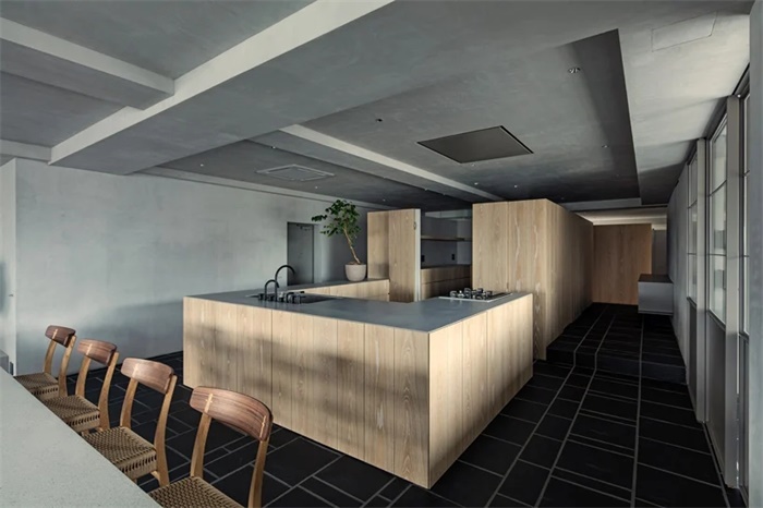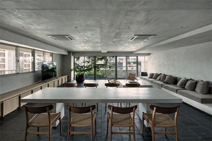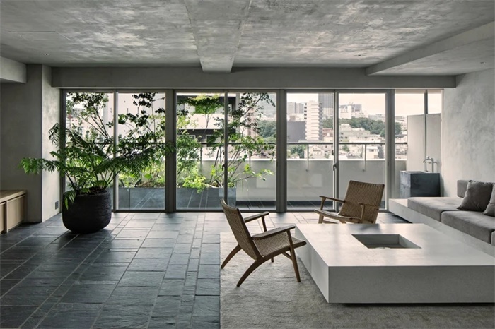 工作室将“惠比寿之家”设计简化为基本要素,创造没有视觉障碍的自由空间。公寓特色是色调柔,采用深色石材地板、灰色抹灰墙和天花板以及类似颜色的家具。椅子和厨柜等木质元素,露台内外的绿色植物为房子增添了温馨气息。