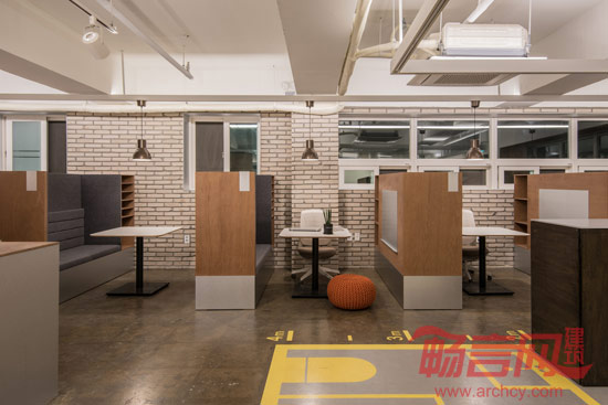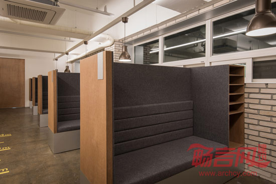 业主要求设计7个小隔间用于房产顾问日常工作、会见客户和签订合同等。设计师提议每隔2米放置一套全方位的办公家具,该家具包括供客户使用的双人座、一台打印机和一个文件柜。房产顾问的就座方向与客户垂直,这样便于他们为客户提供帮助。