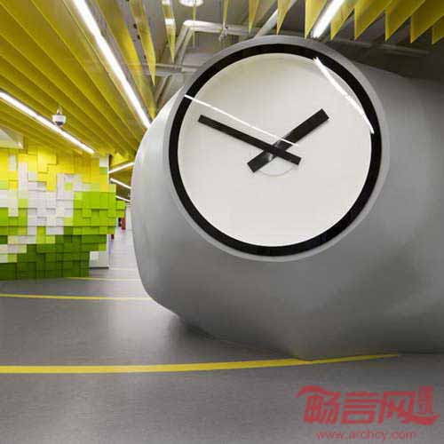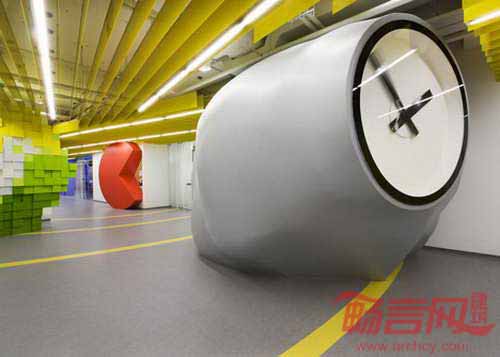 球茎状的钟背后是打印台;缎带形的彩色窗帘后面是会议室。