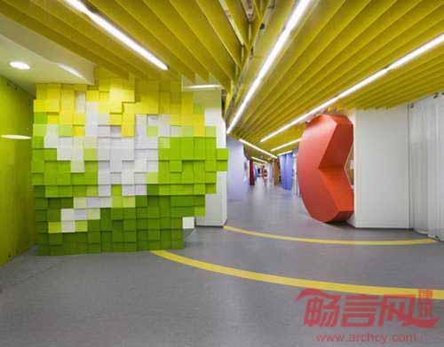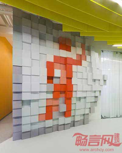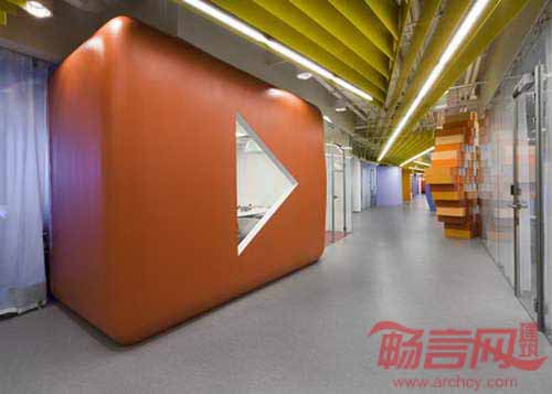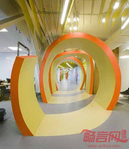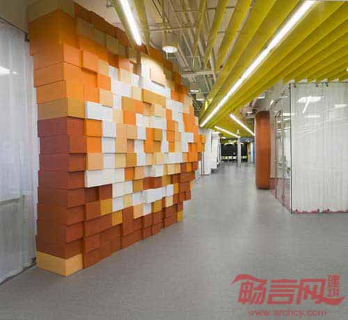 办公室沿200米的通道排布,屏幕和台架呈现出音乐播放键、光标箭头、@符号以及“吃豆子”游戏图标等形状。