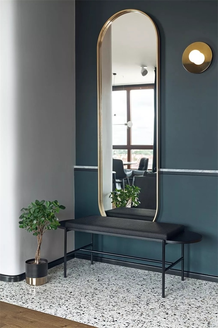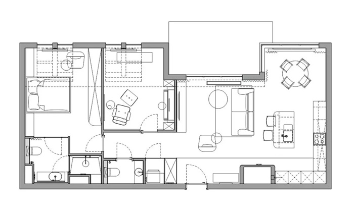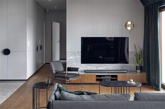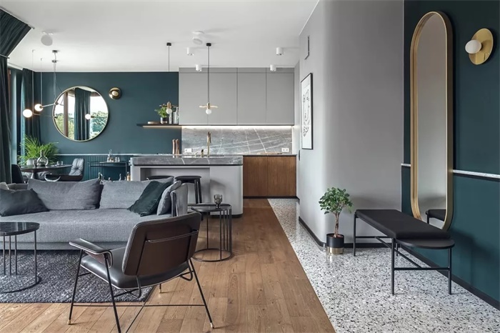 室内以深色调为主,房屋的入口在起居室的中心位置,为了避免突兀,设计师决定将这部分融入客厅中。水磨石铺贴的地面,从玄关处延伸到了厨房位置,墙面 90cm 高的位置还嵌入大理石条装饰。