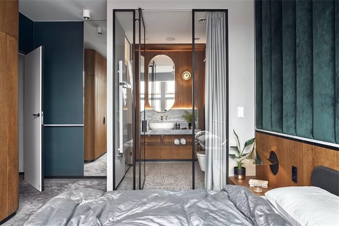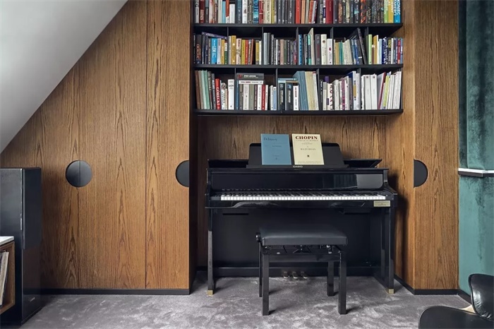 卧室有一个斜屋顶,软包的墙面与木质护墙板相拼接,隔音效果极强。卫生间在内侧,因为采光不足所以选用了玻璃门,内部加入灰色的帘子。原先的小卧室,现在改成了书房。整个设计风格与卧室相似,为了起到隔音的效果,房间内铺有厚厚的地毯和软包的墙面。