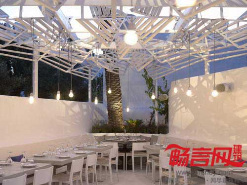 设计师通过现代的视角,体现了传统设计元素。激发设计师灵感的源泉是希腊岛屿的遮阳结构,让人联想起强烈炽热的“希腊之光”。这一建筑元素塑造了餐厅的个性代码。木制凉棚和其转化成为的雕塑结构表达了设计师的观点:将传统观念纳入现代建筑之中。设计从而呈现出颠覆性的表达方式。
