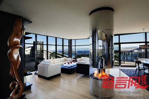 起居室里的特制火炉采用的是镜面抛光不锈钢材料,经过镜面反射,屋内各个角落都能看见炉子里跳跃的火光。“火炉使用的天然气燃料只能从屋顶透过天花板输进来,这给我们增加了很大的设计难度。”设计师说。