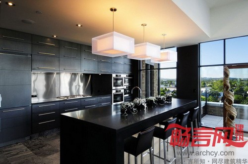 这套室内设计时尚而且精致,地面铺设的是花岗岩地砖,柜台上面也是哑光花岗岩表面,厨房里采用的是不锈钢电器,灶台防溅挡板也是不锈钢材料,连柱子的石膏表面都是经过手工打磨的。