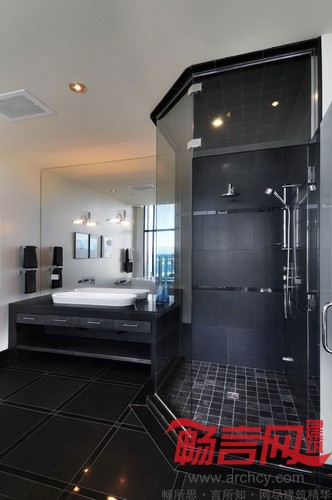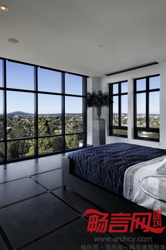 “东北部的卧室内有一扇玻璃滑动门,将浴室和卧房隔开。当玻璃门关上时,通过镜面反射,卧房内的空间就显得更大了。在这间卧房里可以享受美好的晨光,”设计师说:“而从西南部的那间卧室则可以欣赏到远处的山脉和日落景色。每间卧室内都设有衣橱和浴室。”