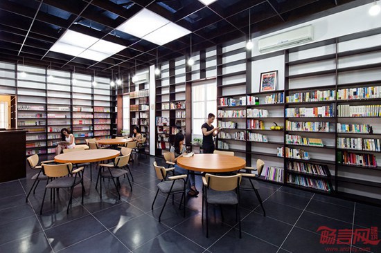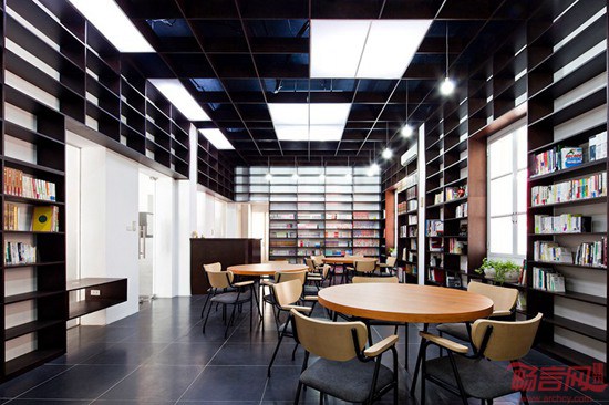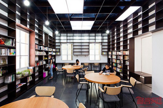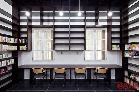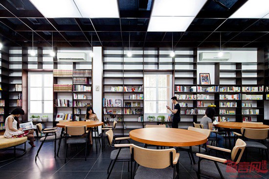 Worklunge 03工作室设计了位于越南河内的日本基金会中心图书馆翻新项目。项目坐落于一座百年历史建筑中,拥有遗产保护价值。由于保护性质,外立面和结构被禁止修改。另外,砖砌工艺导致图书馆房间和窗户较为狭小。为了应对这些障碍,设计方案是将图书馆房间同内部文化中心打通,增加其空间尺寸,改善开敞性。