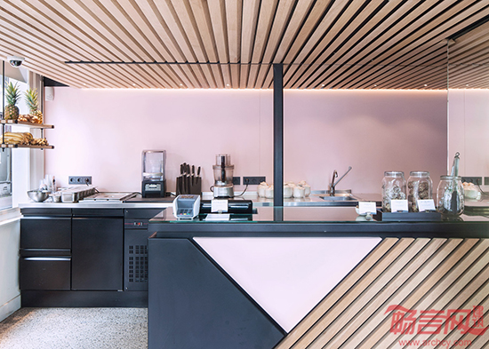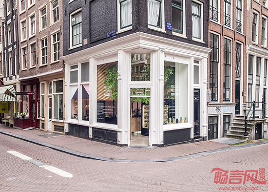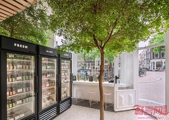 建筑事务所Standard Studio在荷兰阿姆斯特丹一家果汁店的室内设计中,在店内种植了一个绿树,映射出阿姆斯特丹这座城市中隐藏着的绿色空间。