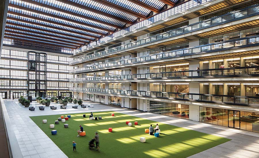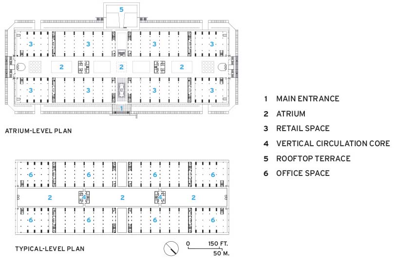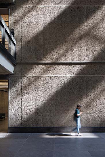 建筑的外墙被保留下来,一并保留的还有三个东西向的中庭与两个南北向的中庭。此外,设计还保留了原有的开放式人行道与连廊。在实验室外围的走廊设置上,由于租户希望拥有面向外部的开窗,曾经的房间对于出租来说变得困难起来,如今设计团队也以玻璃幕墙进行替代。入口处的下沉式交流区也被保留下来,原有的耐候钢玻璃天窗的设计也保持了原貌。