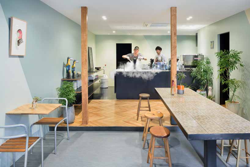 TORAFU建筑事务所重新设计了位于东京中野区的冰激凌店。项目名为“白雪野餐”,商店将冰激凌制作过程呈现给顾客,厨房和柜台如同用于精巧演出的舞台。商店共有三层,各层都有不同的地面。为了建立连贯的统一感,设计采用了相同的材料。桌面和入口地面运用了复古地砖,其他区域大量采用木质原料。顾客可以围坐在中央台桌附近,也可以选择沙发或悬挑桌子落座。