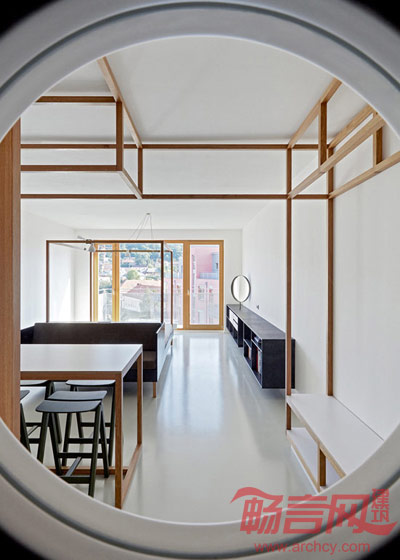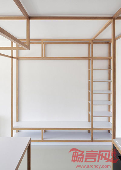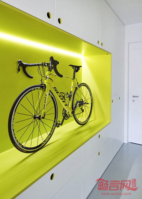 在与浴室和储藏间相邻的客厅里,一个黄色的橱柜内展示着业主心爱的自行车。