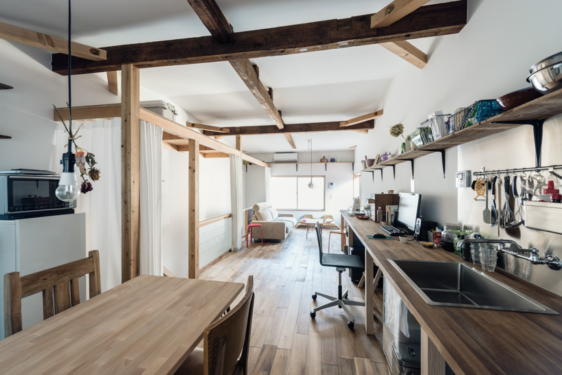 Toyosaki是距离北大阪Umeda车站步行只需15分钟的小镇。小镇城区后巷有一排老旧的排屋。在一条巷子中,坐落着Kazuteru Matumura建筑事务所的办公场所、Retoyosaki住宅。在最近一次翻修中,项目的外保温得到了替换,以适应日本四级耗能要求。空间设计成开敞布局,包含两个室内房门(厨房和卫生间)。其他房间由门帘加以分隔,从而获得更灵活的布局。相对于64平米的总体面积,门厅较为开阔,同时起到了储物功能。翻新过程预留了原先的地板和房门,用在不同环境和场合。包含门厅在内的储物区展现了主人物件、生活和爱好习惯。