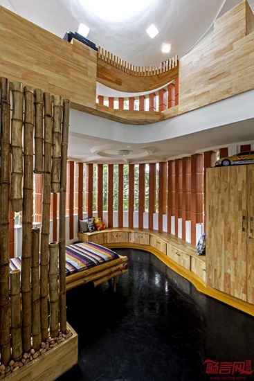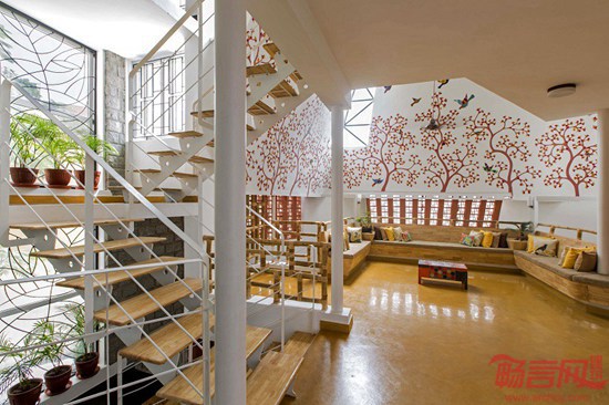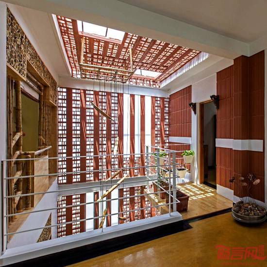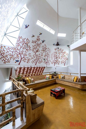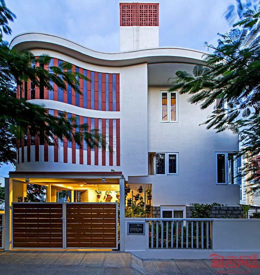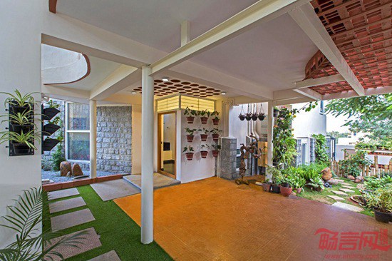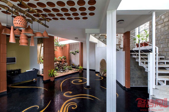 Kham工作室设计了印度班加罗尔Prasanna Nairs住宅。项目用于展览印度传统工艺品,设有标志性设计元素,例如氧化物地板和竹材料家具。另外,室内创造了用于印度艺术品制作展示的大画板。建筑共有三层,由于视觉连贯性,空间显得丰富多样。一层容纳两个花园,会客的社交区和家庭剧院。中央花园利用印度传统屏风,营造了墙面上有趣的光影变换。
