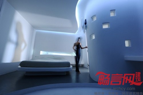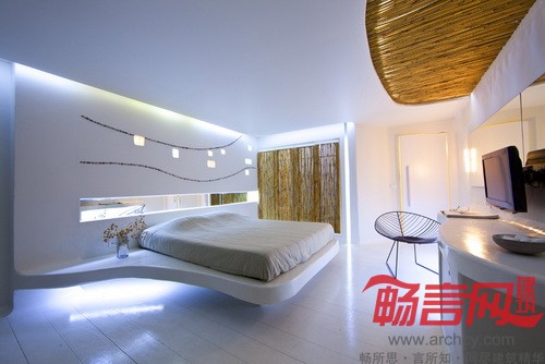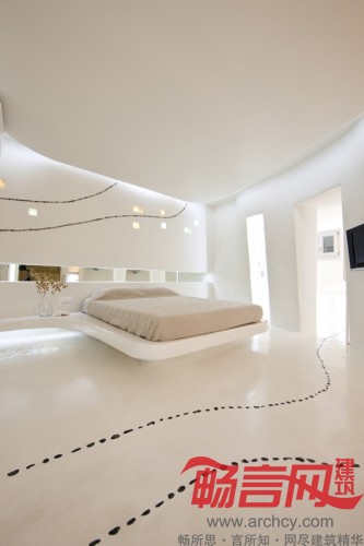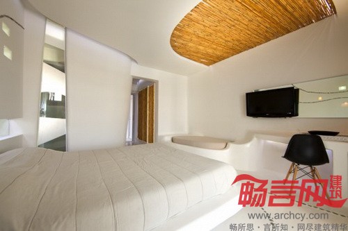 客房内部墙壁并不相连,而且都是向内倾斜的。设计师将家具与墙壁整合到了一起,让人感觉到这座酒店好像是从米克诺斯岛的岩石地面上生长出来的一样。