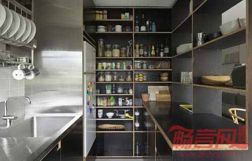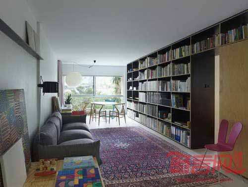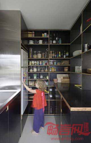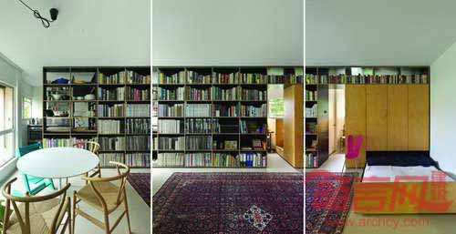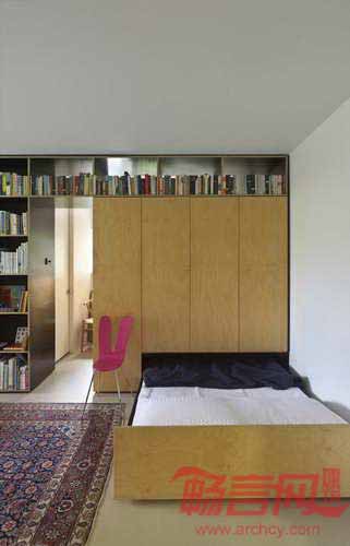 设计师将原有的木质结构全部去除,但保留了浴室的核心部分,添加了一个7米长的木柜,用来容纳主人一家几乎所有的用品——书籍、儿童玩具、食物、酒类餐具、花盆、衣物,甚至双人床也包括在内。房屋一侧是厨房和食品室,而主要木架区域是开敞式设计,保证了通透性。另外一侧的衣柜将儿童房和起居室分隔开,衣柜下方安置了主人使用的推拉床。所有物品都摆在自然、方便的位置。
