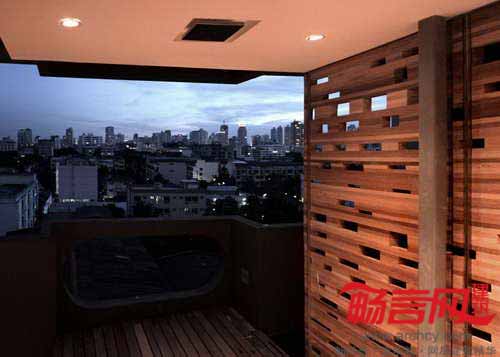 位于泰国曼谷的一套旧高层公寓经改造后,在原有的阳台和起居室基础上,添加了一个户外浴室。改造设计尽可能多地利用了现有元素和条件。公寓处于建筑拐角处,位于市中心的建筑远离主干道,临近泰国最大的"klongs"(运河)。