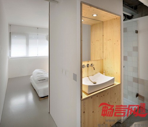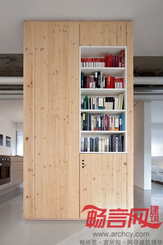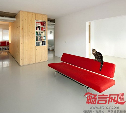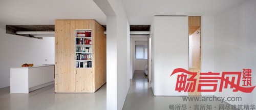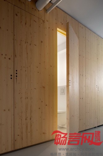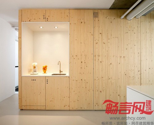 翻新之后,房子内部具备了非常明晰的线条感。一个大木箱子将室内白天活动区和夜间休息区隔开,这个大箱子功能丰富,它集储物区、衣柜、洗手间和厨房于一身,这样就大大节省了室内空间。