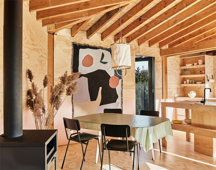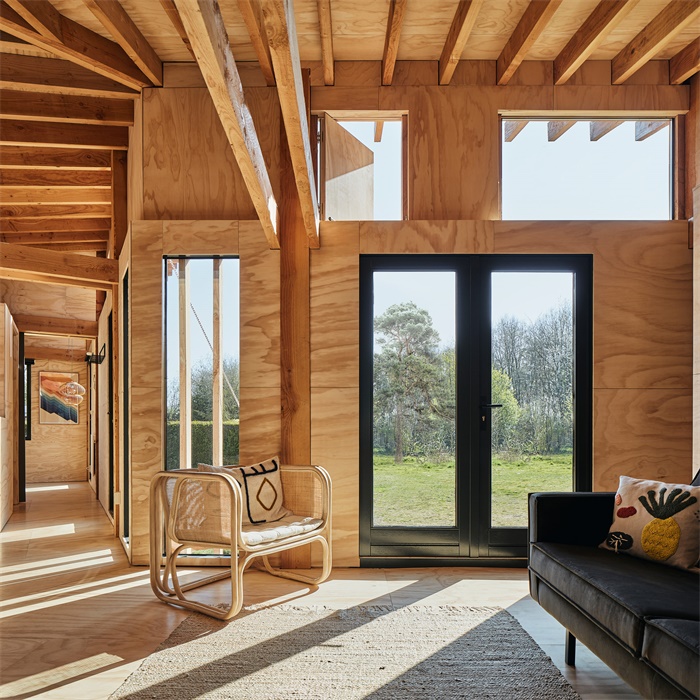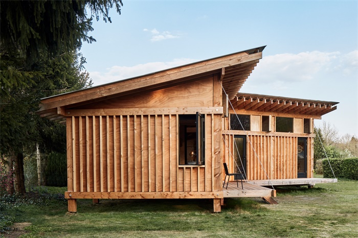 Crafted Works设计工作室设计了一座荷兰小木屋,设有暴露室内布局的外部结构框架。这是一座单层木屋,位于荷兰德伦特省靠近德国边境的度假公园内。其建筑结构也成为室内的关键部分。