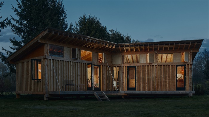 设计师表示,设计主导因素是结构和材料表达。各种建筑元素都从如何对外显露结构角度考虑的,而不是将其隐藏在衬板后面。这种理念有助于在展示建造过程中所涉及的工艺,同时为住宅创造独特的个性。房屋选用道格拉斯冷杉建造框架,镀锌钢螺旋桩基础,外墙螺栓,屋顶椽作为支撑。