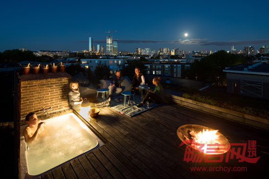 在这里,传统的建筑细节和复杂的木制品与现代元素的新奇轮廓相互交融。承重内墙里的空穴提供了通风条件。业主在享受桑拿、泡澡和漩涡浴的同时,可以欣赏鹿特丹壮丽的城市风景。