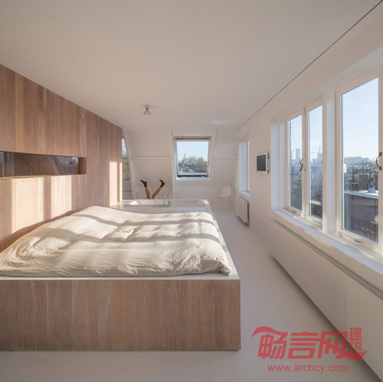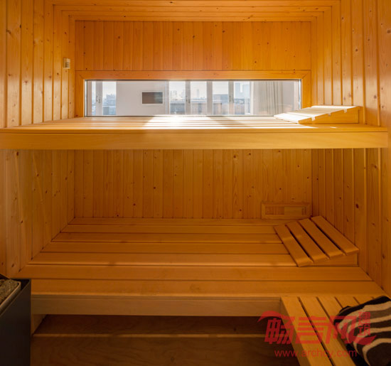 在四楼卧室,所有的承重内墙均已拆除,室内中央位置有一个巨大的L形结构,其水平部分布置了床和浴缸,垂直部分布置了桑拿室,并且安装了观景窗。
