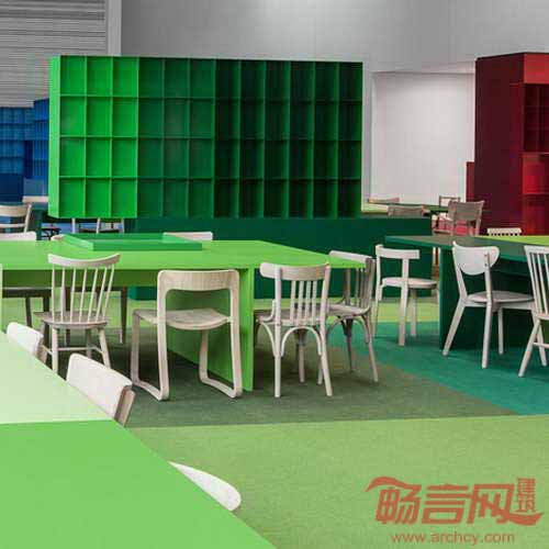 每个“浮岛”上都安放了桌子、椅子、架子和柜子,色调略微有些差别。