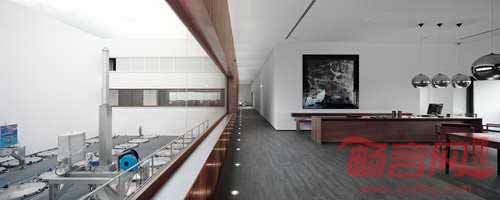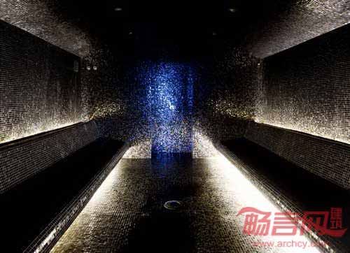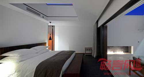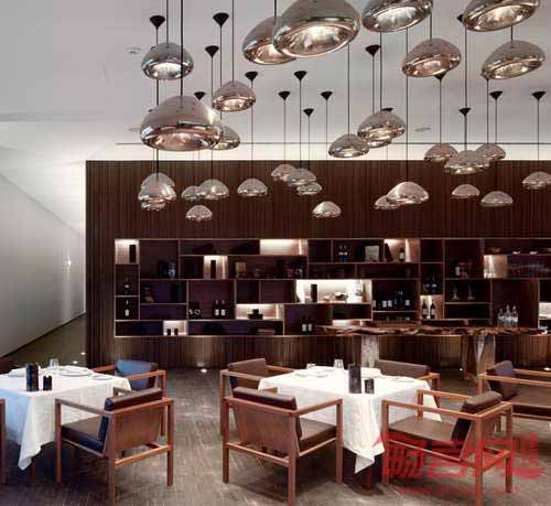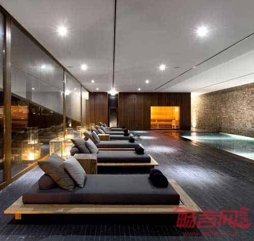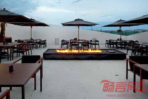 度假村采纳了大地基调,棕色和黑色色调,厚重色彩由一系列自然木质纹理体现。垂直窄木板与拼接软地毯呼应,同时与黑色硬质木地板形成反差。天花板上悬挂着几个不同高度的光亮铜球吊灯,令人联想到酿酒设备的工业属性。室内外空间随处可见坚实木质边桌,壁炉嵌在钢铁框架内,暖色火焰从黑色岩石中喷射出来。