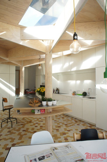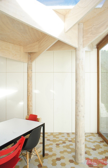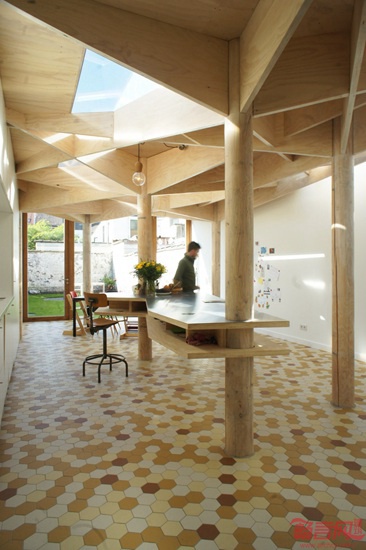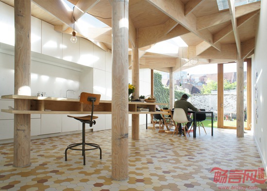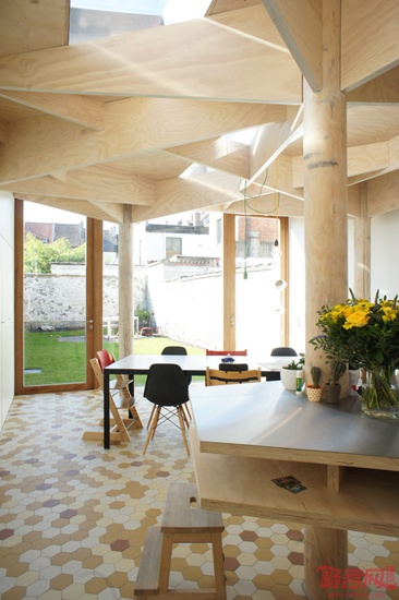 Atelier Vens Vanbelle公司设计了比利时Ghent的住宅。项目特色是拥有树干和树枝制成的柱子,让住户仿佛置身于花园。业主委托设计师完成一个增建空间,将小型封闭花园同后面的住宅连接起来。木质柱子分布在250平米的区域中,空间功能涵盖一层厨房和二层浴室。