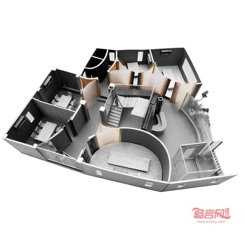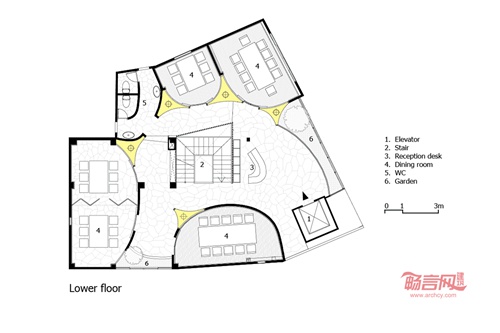 考虑到餐厅现有的不规则的结构布局,设计师采用了弧形墙壁来增加室内空间的多样性以及柔和、舒适的氛围。多面弧形墙壁交汇形成的三角区域则被设计成了灯柱。