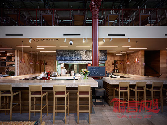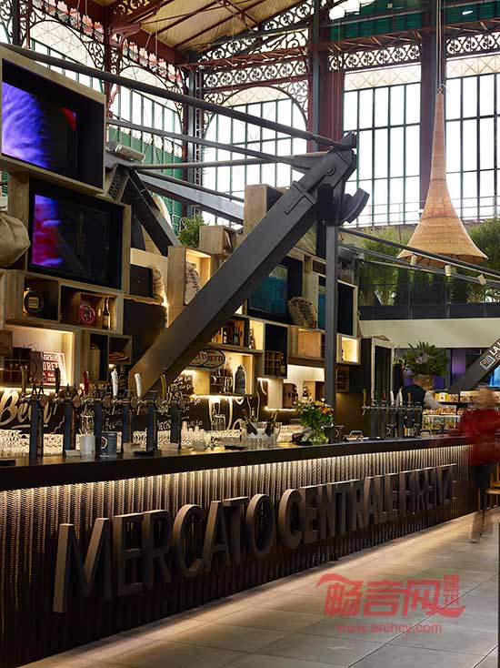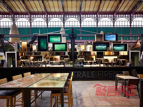 在服务区,尽管各个部分都保持其各自的功能特性,但是设计出来的效果却是和谐且热闹的市场。佛罗伦萨中心市场的顶层已经焕然一新,现在成为欧洲传统食品及红酒市场的一个重要场所,也是一个利用典型文艺复兴方式将现代和传统相结合的建筑。这是一个从过去精髓为一个无用的且老式的位置不便的项目,慢慢更新为佛罗伦萨的服务— 一个将其建筑连同历史及价值连为一体的城市,旨在保持其本质。