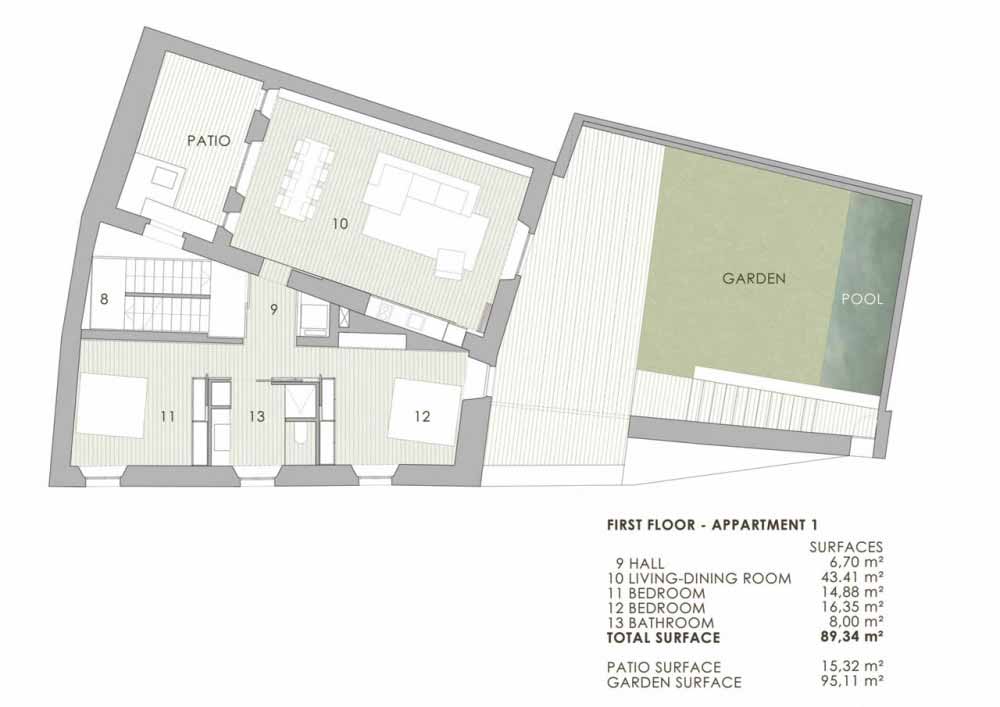 Alemanys 5住宅楼改造项目位于西班牙Girona中世纪老城区中,俯瞰Sant Domenec广场,建筑年代可追溯到公园16世纪。最近一次改造采用了新旧结合形式,素淡简炼的线条旨在突出建筑的基本元素,包括空间、光线、阴影、火、石头、水和静谧。建筑容纳了两套面积和特点不同的家庭公寓。其一是面积180平米的复式住宅,包括主套间和两个儿童房、带壁炉的起居室、向南的壮观露台,可领略整个古城区的景致。另外一套是面积100平米的公寓,包括两个大卧室、宽敞的浴室、融合厨房区域的起居室、带有阳光露台和泳池的宜人的私家花园。建筑可以对外整体出租,5个房间可容纳10-12人。