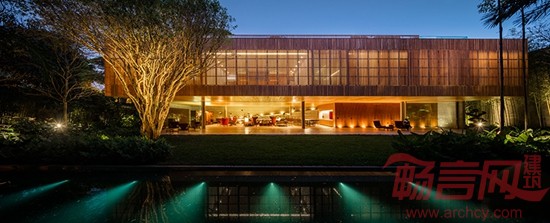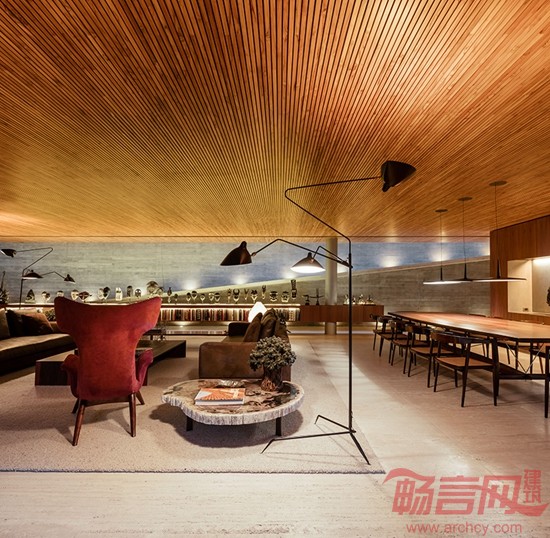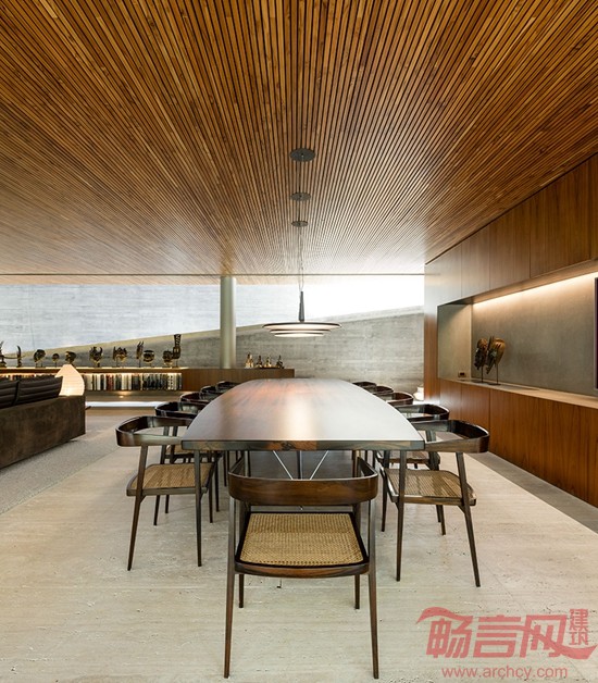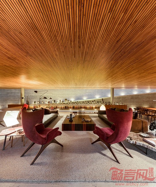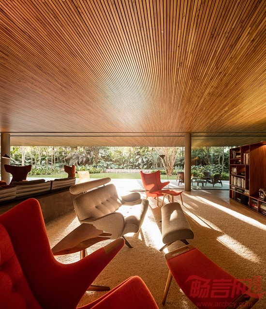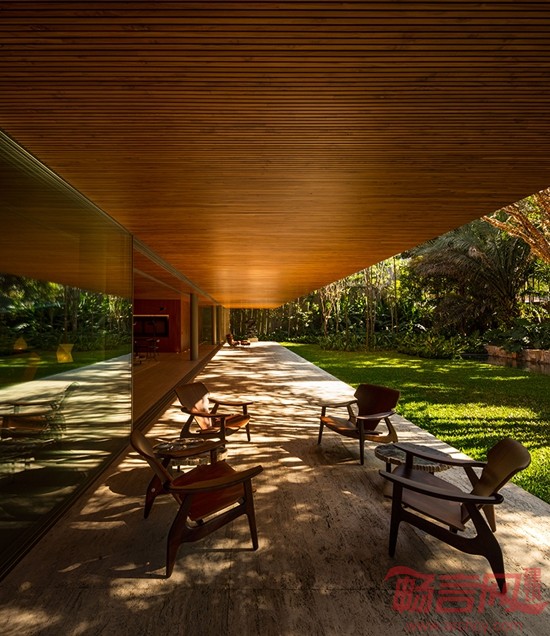 室外,在悬臂下方建造一条4米宽的走廊,形成了一个有顶棚而又开放的空间。此外,为了增加空间延续性,巨大的滑动玻璃门可以完全打开,将起居室和花园连起来。