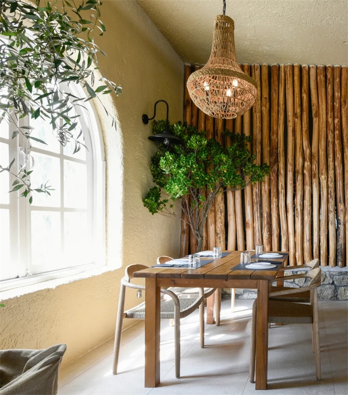 由于空间有限,将廊房改造成功能齐全、舒适宜人的住所极具挑战性。为此,设计师在外墙采用大的开间,并搭配简洁的线条与天然材料,创造了一个闲适而宁静的环境,与 “Akti oneirou 豪华露营地”的夏日氛围相呼应。
