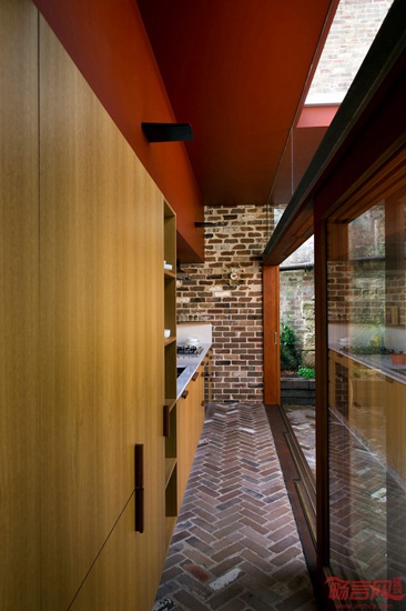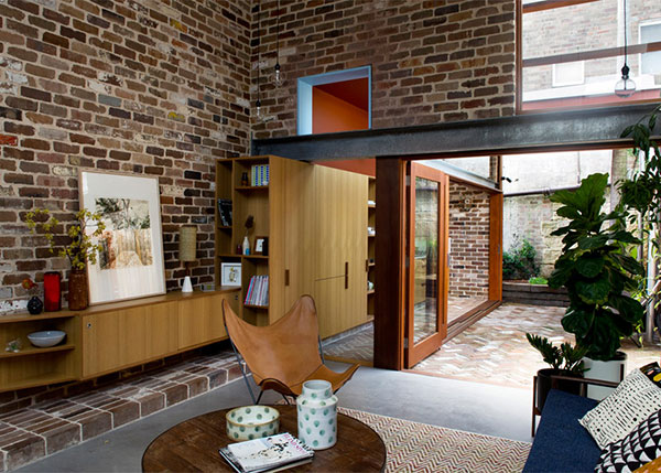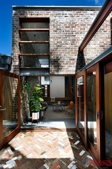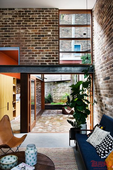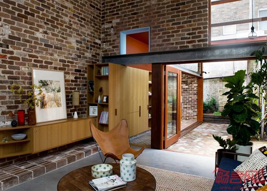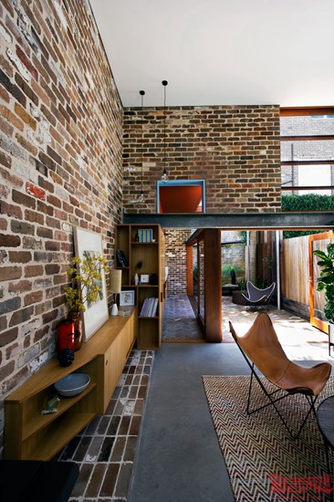 澳大利亚建筑师David Boyle设计了位于悉尼的心理学家住宅。这一改造项目利用了回收砖块,包含双倍层高的起居室,夹层卧室和soho办公室。项目几面均被其他建筑包围,导致采光的缺失。为了应对采光不足问题,设计师添加了高天花板的起居室、天窗和玻璃门,提升了光照条件。