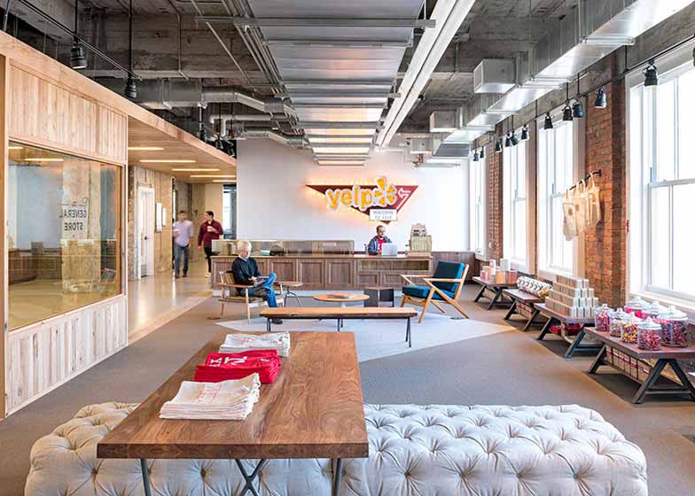 旧金山Studio O+A工作室曾经成功设计了Facebook总部和Evernote总部办公室,目前该公司完成了旧金山在线导航公司Yelp办公空间设计。Yelp公司从一座小规模郊区办公室搬迁至旧金山市中心、年代久远的高层建筑中。这座艺术装饰风格的建筑建于1920年代,共有26层,由建筑师Timothy Pflueger设计。Yelp公司位于建筑的2层至14层,设计要求是营造科技公司“园区”感,鼓励位于不同楼层间员工的交流。设计师表示,“设计关键是垂直园区概念,方案保罗万象,在多层空间中创造了自给自足的社区。”办公室拥有清水砖墙,糖果罐、古董纪念品、收银台和荧光灯标志营造了复古杂货店风格。