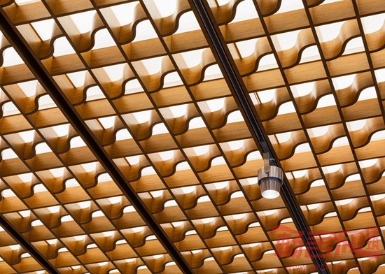 大厅前部采用了玻璃墙,人们从外面可以清楚地看到零售区,这里采用了橡木地板和曲形木片制成的独特天花板。