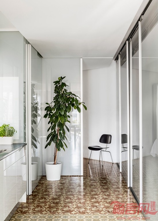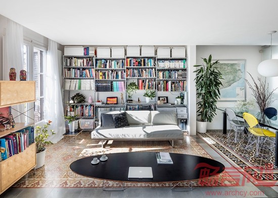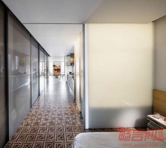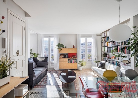 建筑师事务所Narch对巴塞罗那的一套公寓进行的翻新,拆除了许多原有的室内墙壁,并通过不同图案的地板来区分各个空间。
