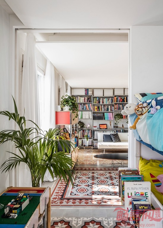 这座古老的公寓位于巴塞罗那的Eixample区,建筑面积为65平方米。业主要求将其改造成宽敞的家庭居住空间,为了达到这一要求,设计师拆除了许多室内墙壁,采用了简单直接的开放式空间。拆除墙壁的同时,室内不同拼接画图案的地板展露出来,风格各异,别具一格。这些地砖属于釉面地砖,是巴塞罗那的传统建筑材料。