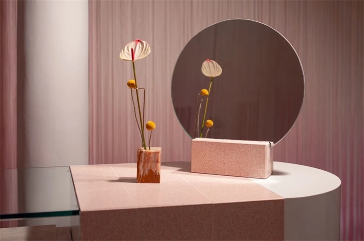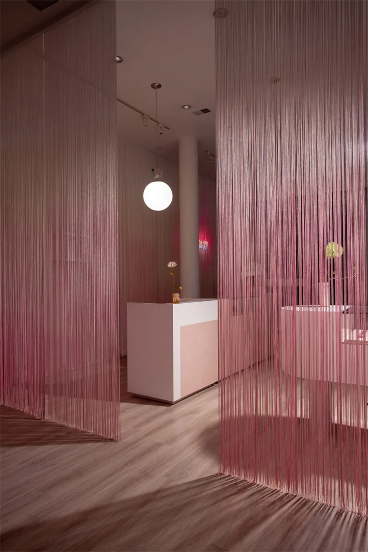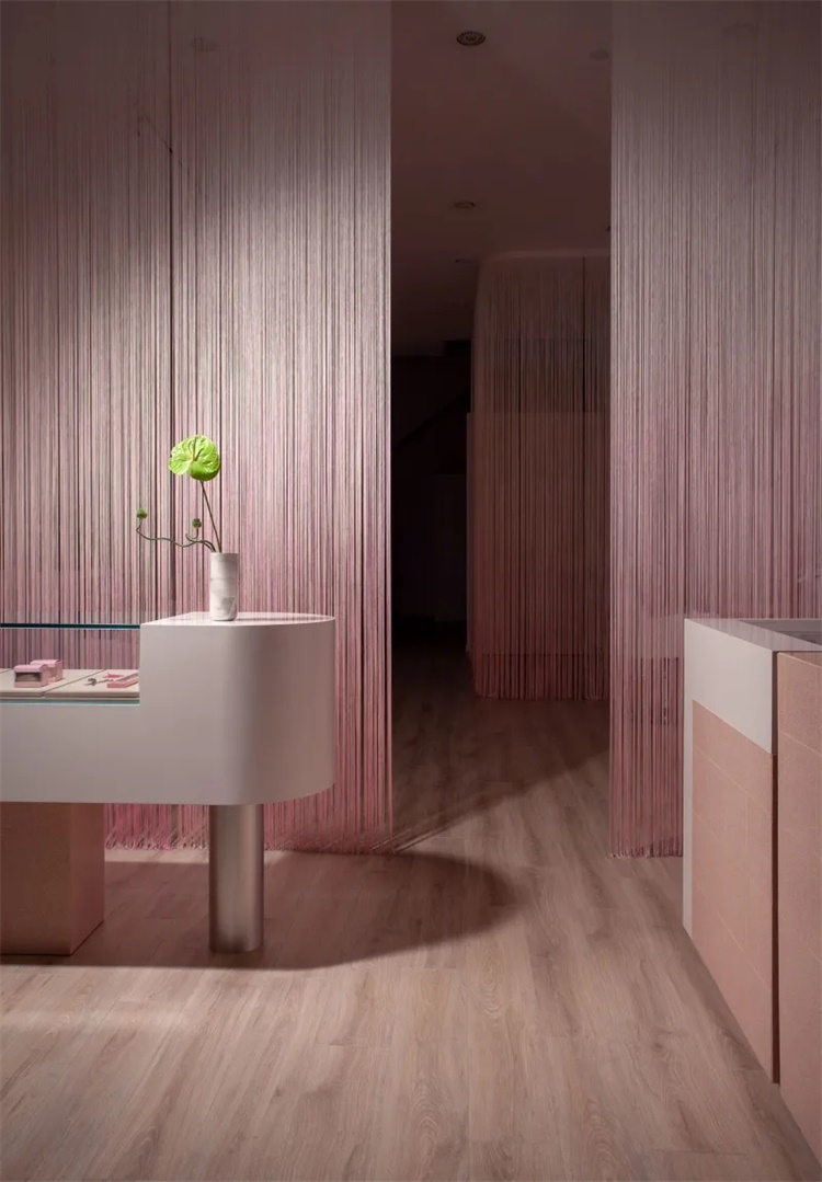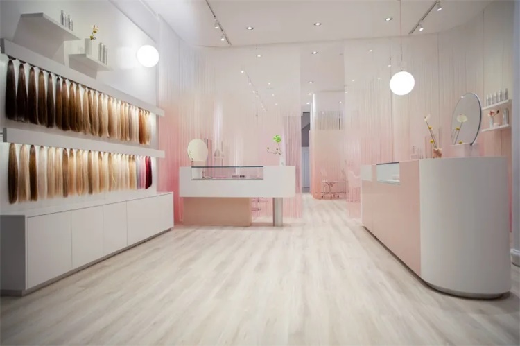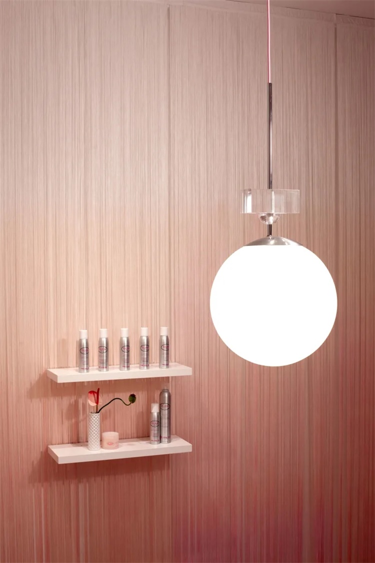 作为在线业务,Glam主色调是粉色和白色。设计师需要将品牌转化为一个实体空间。美发沙龙采用光滑的奶油色和千禧粉色,闪烁的窗帘界定和分隔了商店的两个区域。与配色方案一致,窗帘、沙龙柜台、陈列柜同简洁、现代复古风格和线条形成了优雅对比。展品区域使用玻璃表面,部分采用手工制作的粉色水磨石材料。