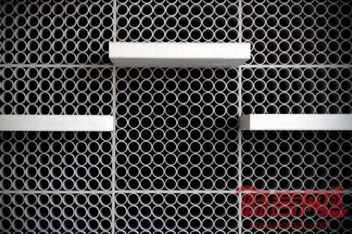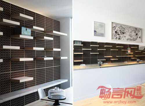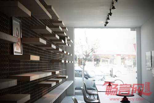 店内最具特色的装饰是一块由回收硬纸筒组成的预制模块体系,纸筒模块被安装在中密度纤维板之间,提供了个性化的室内装饰效果。这面墙对面是一面长长的镜子,镜面反射了陈列品,使顾客连贯地浏览店内商品。